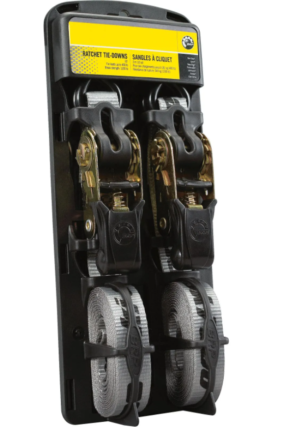 Meet our Ratchet Tie-Downs, which help you securely pack up to 400 lb (181 kg). It comes with a rubber handle, coated hooks and in packs of two.